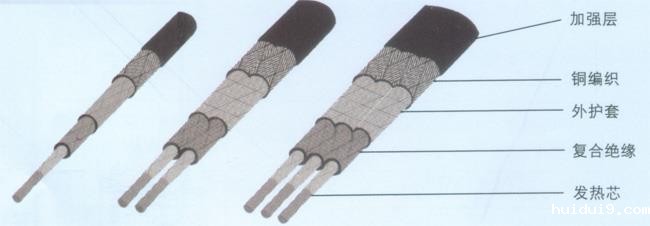 HCL型串联式恒功率电热带的绝缘护套及外绝缘护套均为F46或F4,发热芯为特种发热器材,加强铜编织外防套内绝缘护套发热芯。
