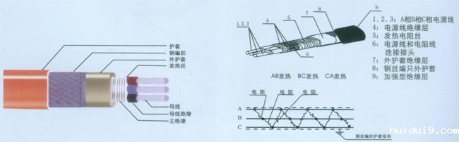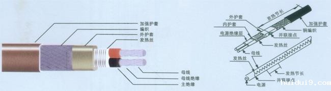 电源母线为二根或三根平行绝缘铜导线,并在其表面上绕缠电热丝,并将该电热丝每隔一定距离(“即发热节长”)与母线连接,形成连续并联电阻,母线通电后,各并联电阻发热,因而形成一条连续的加热带。